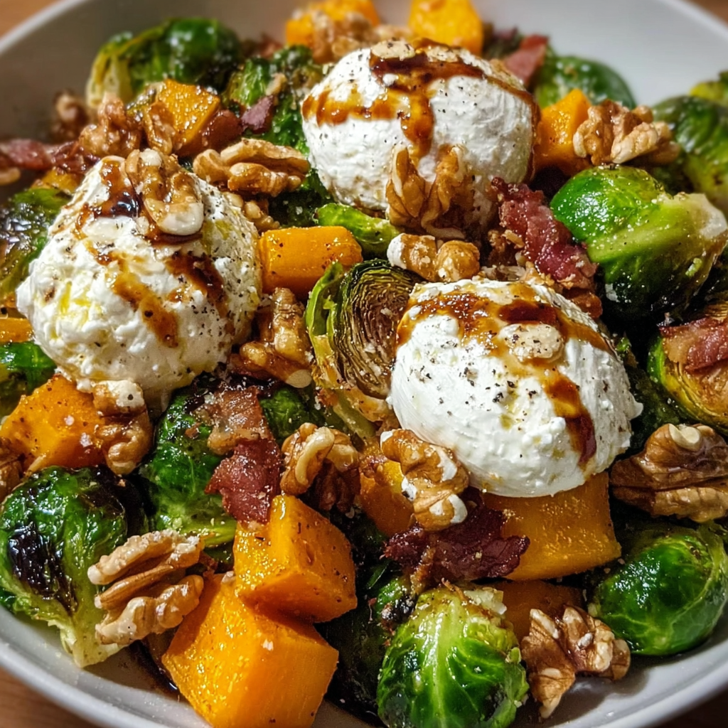 The interplay of the earthy Brussels sprouts and sweet butternut squash, drizzled with a sticky maple glaze, creates a harmonious balance. Adding crunchy walnuts and crispy bacon introduces an irresistible contrast, while the creamy burrata and tangy feta elevate each bite to new heights. Leverage this seasonal dish to impress guests or simply indulge in a cozy night in.
