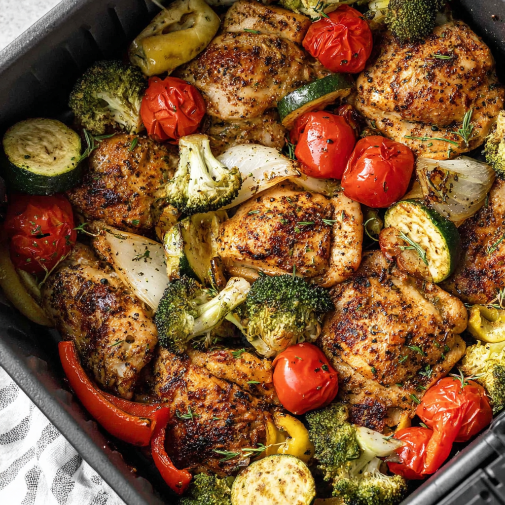 If you don't have an air fryer, you can bake the chicken and vegetables in a regular oven at 425°F (220°C) for about 20-25 minutes, ensuring you check for proper doneness.